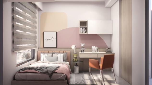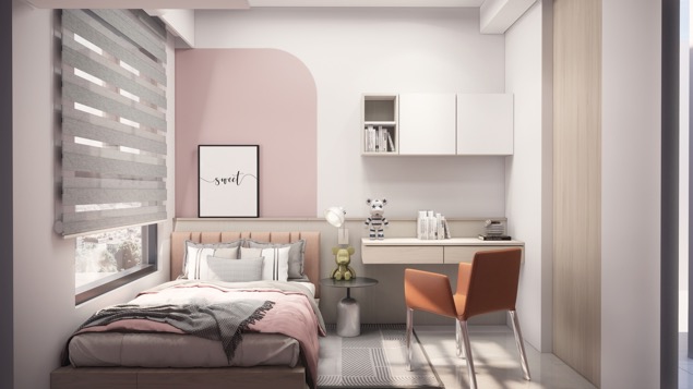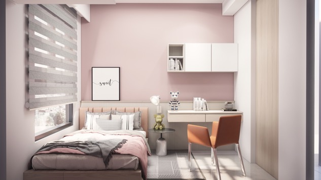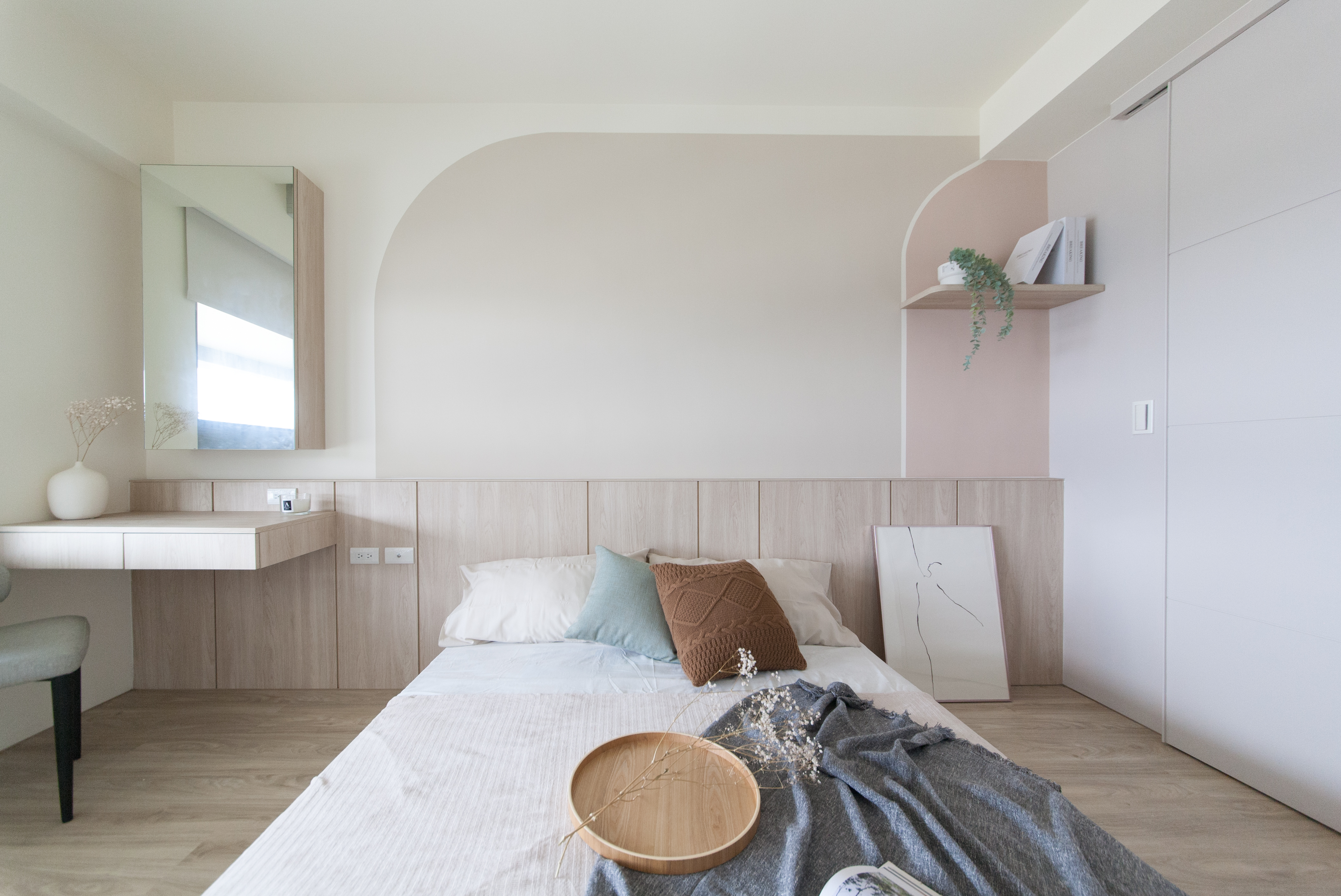 若改將部分主牆區塊漆成玫瑰粉,除了視覺更加明亮開闊之外,空間氛圍也較為成熟內斂。