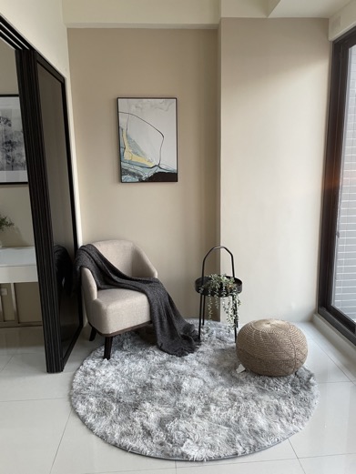 利用奶茶色作為主要視覺色,選擇以灰白相間的長毛地毯作為氣氛勾勒元素,再點綴上黑色線條畫作和邊桌,小空間也能成就溫暖又充滿個性的風格。
