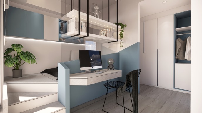 以白色(60%)為基底的套房空間,經由灰藍色(30%)色彩的切割,不但巧妙地化分公司領域,同時也能營造出愜意放鬆的氣息,再透過黑色鐵件(10%)的點綴,描繪出時髦現代的個性。