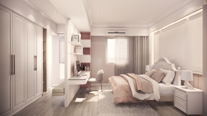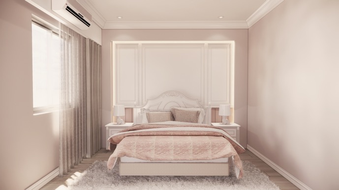 以大量粉紅色(60%)做為主視覺的臥房,經過加入白色(30%)線版裝飾,提升優雅柔美的氣質,適度點綴上灰色布簾、單人椅和地毯(10%),讓粉色空間更具成熟韻味。